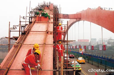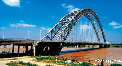 全长1402.15米,主跨338米,单跨下承式钢管砼变高度桁式有推力无铰拱桥,2004年10月建成通车。共46个吊装节段,单节段最大吊重121.8吨,公司承担吊装工程。