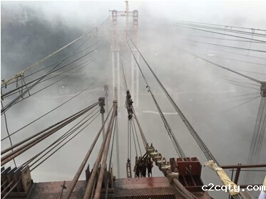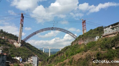 大桥采用无支架缆索吊装施工技术,该技术工艺极其复杂,C100砼是首次在国内桥梁工程应用,其科技含量极高且对桥梁工程发展意义重大。由于古蔺地处山区交通极为不便,气候条件恶劣,开工时间较原计划晚了一年之久,工期紧、施工难度极大,面对重重困难,项目部全体员工在领导班子的带领下充分发扬了伟大的“川桥人”精神,勇于担当,敢于破难,团结一心,艰苦奋战,大力开展科技攻关,科学组织施工生产,取得了一个又一个的阶段性胜利,2014年3月20日拱座开挖,2014年5月拱座施工完成,2014年10月交界墩施工完成,2014年11月7日索塔拼装,2014年12月31日索塔拼装完成,2015年1月31日缆索系统形成,2015年2月6日开始吊装主桥钢管劲性骨架,2015年3月28日劲性骨架合龙,50天实现了主桥合龙,其中凝聚了“川桥人”的艰辛、智慧和汗水。