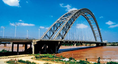 全长1402.15米,主跨338米,单跨下承式钢管砼变高度桁式有推力无铰拱桥,2004年10月建成通车。共46个吊装节段,单节段最大吊重121.8吨,公司承担吊装工程。